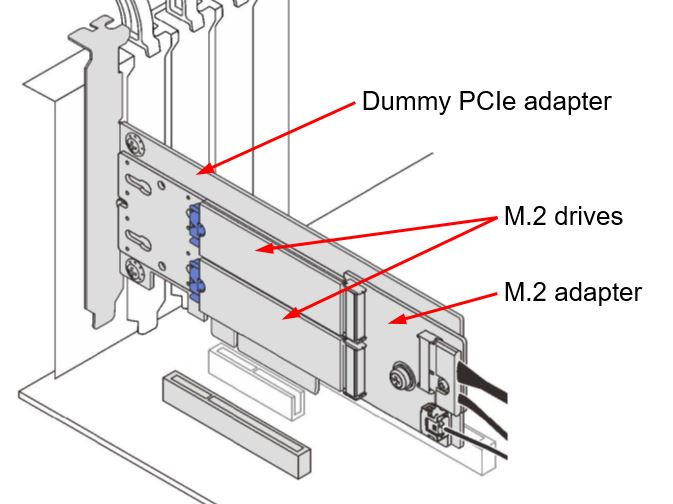 PCIe adapter is in turn installed in a PCIe slot. The M.2 adapter