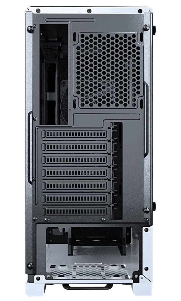 Skříň formátu Middle Tower nabízí tři 2,5" pozice pro SSD disky a dvě 3,5" pozice pro pevné disky. Na horním panelu se nachází dva USB 3.0 porty, sluchátkový výstup a audio vstup pro mikrofon. Skříň je vybavena dvěma 120 mm ventilátory s RGB podsvícením, které spolu s průhlednou bočnicí zajišťují vytříbený design skříně. Důmyslné řešení umožňuje pohodlné umístění až 280 mm dlouhého výměníku vodního chlazení na přední straně. Ve skříni je dostatek prostoru pro chladič CPU do výšky až 170 mm a grafickou kartu o délce až 400 mm. Skříň je dodávána bez zdroje. Součástí je také sada prachových filtrů.