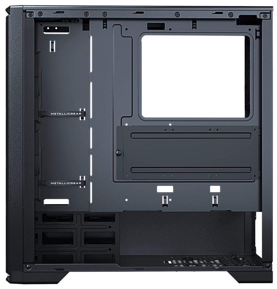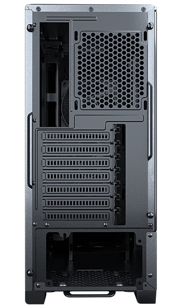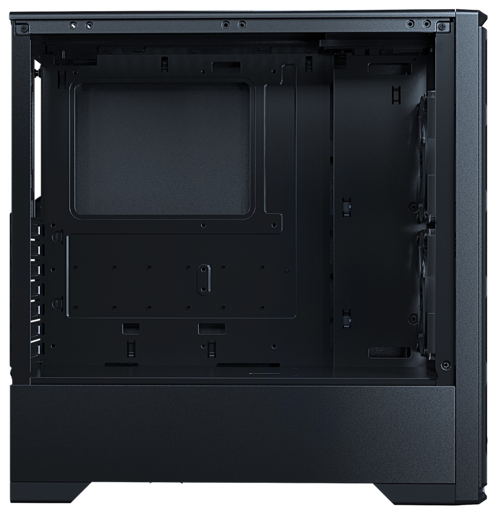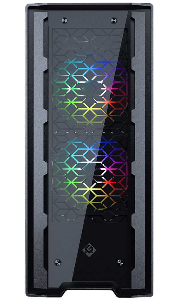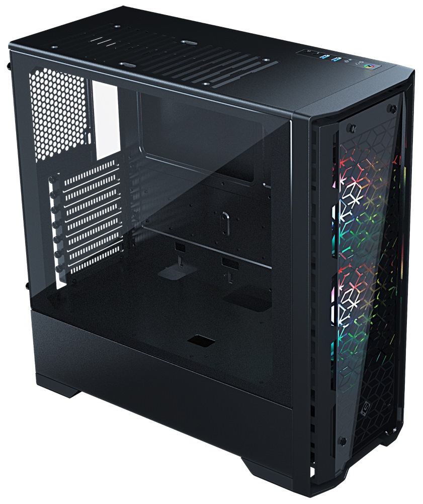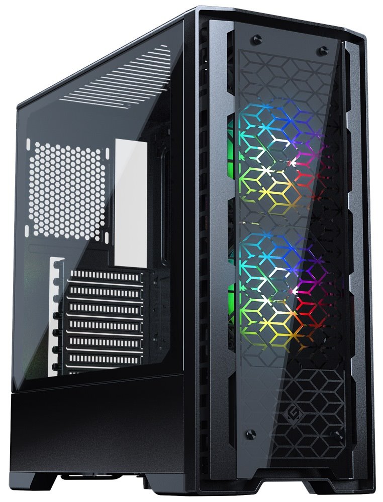 Skříň formátu Middle Tower nabízí tři 2,5" pozice pro SSD disky a dvě 3,5" pozice pro pevné disky. Na horním panelu se nachází dva USB 3.0 porty, sluchátkový výstup a audio vstup pro mikrofon. Skříň je vybavena dvěma 120 mm ventilátory s ARGB podsvícením, které spolu s průhlednou bočnicí a předním panelem z tvrzeného skla zajišťují vytříbený design. Důmyslné řešení umožňuje pohodlné umístění až 280 mm dlouhého výměníku vodního chlazení na přední straně. Ve skříni je dostatek prostoru pro chladič CPU do výšky až 170 mm a grafickou kartu o délce až 400 mm. Skříň je dodávána bez zdroje. Součástí je také sada prachových filtrů.