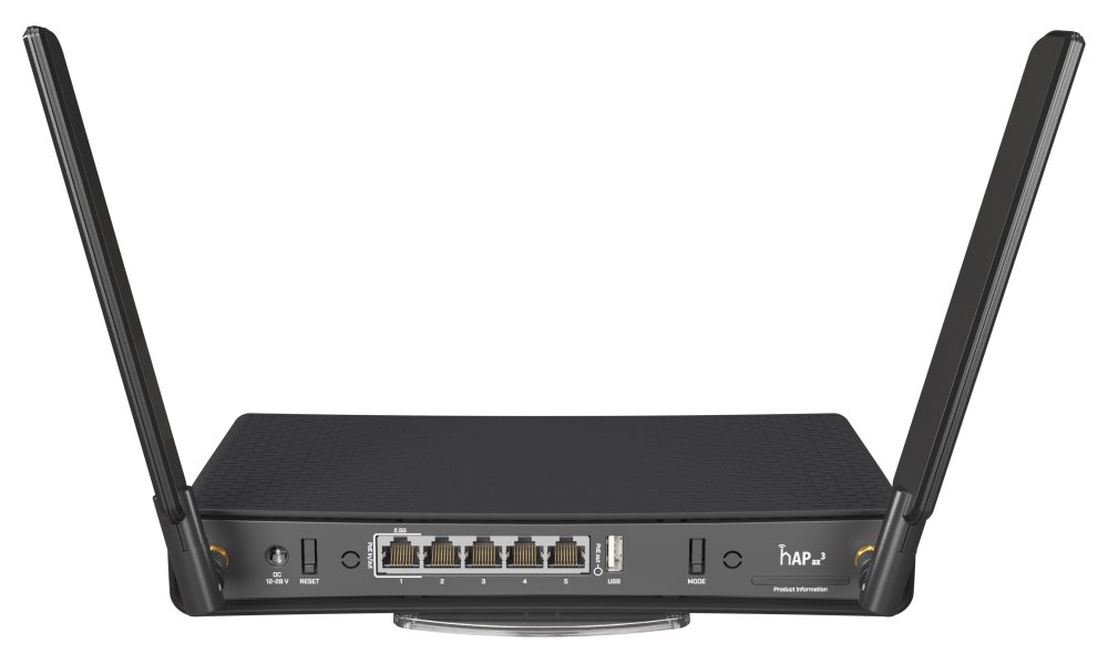 MikroTik hAP ax3 je špičkový domácí přístupový bod AX (802.11ax + Wave 2) pracující v pásmech 2,4 a 5 GHz. Tento Wi-Fi router/AP disponuje čtyřmi GbE porty a jedním 2.5G portem s podporou PoE-in/out. Dvě externí antény se ziskem 3,3 a 5,5 dBi zajišťují stabilní bezdrátové připojení a optimální pokrytí. Další výhodou je i možnost připojení USB disku nebo např. 4G/LTE modemu přes USB konektor. První port navíc podporuje pasivní PoE vstup/výstup, díky čemuž může router napájet další externí zařízení (např. wAP jednotku). Router nabízí i vysoký výkon v podobě 4jádrového ARM procesoru Qualcomm IPQ-6010 pracujícího na frekvenci 1,8 GHz, 1 GB paměti RAM a 128 MB NAND paměti. Router je dodáván s operačním systémem RouterOS v7 L6.