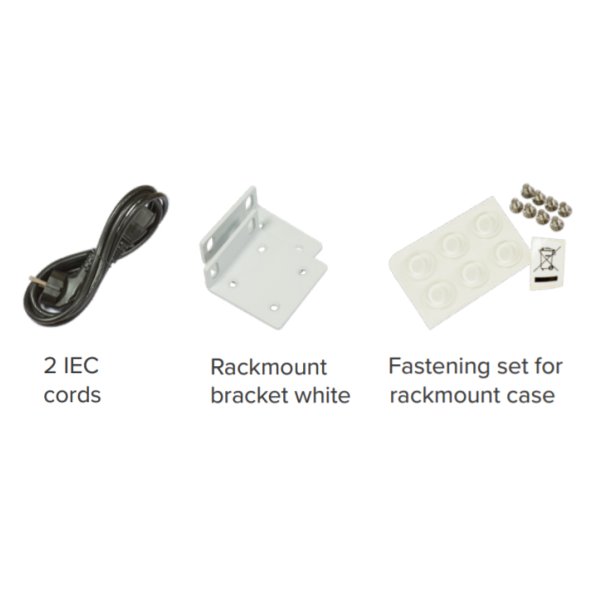 Balení obsahuje: Cloud Core Router CCR2004-1G-12S+2XS v hliníkovém pouzdře určeném pro montáž do racku (1U), dva napájecí kabely a rackmount kit.
