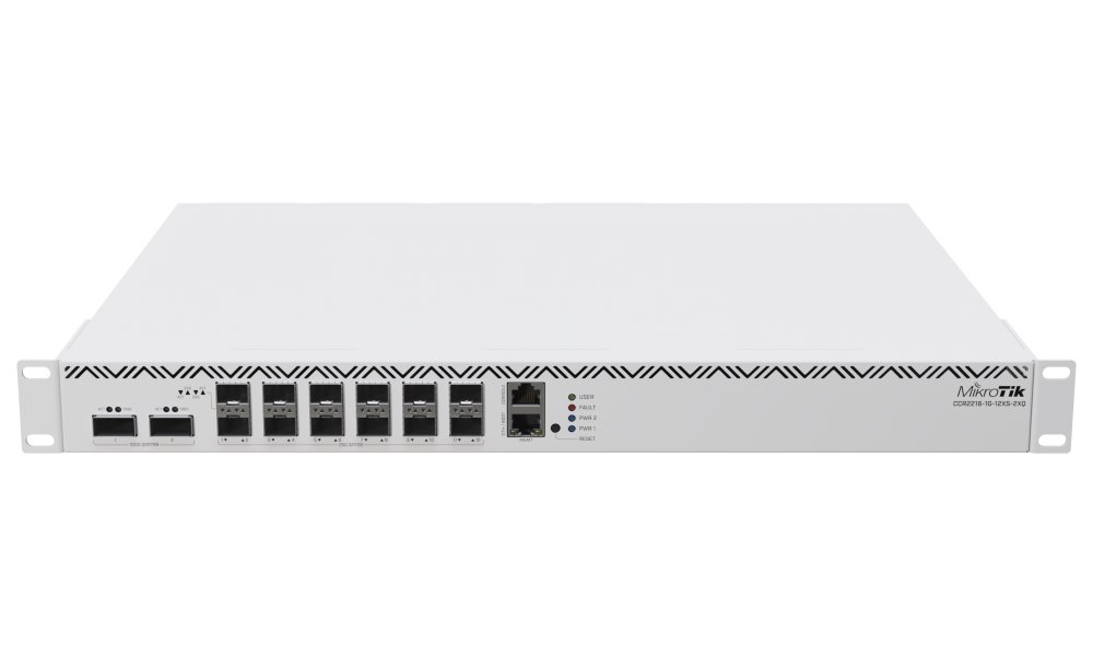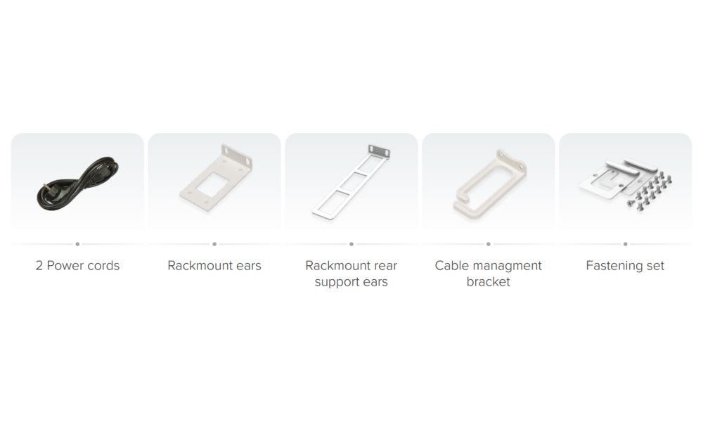 Balení obsahuje: Cloud Core Router CCR2216-1G-12XS-2XQ určený pro montáž do racku (1U), dva napájecí kabely a kompletní montážní sadu.