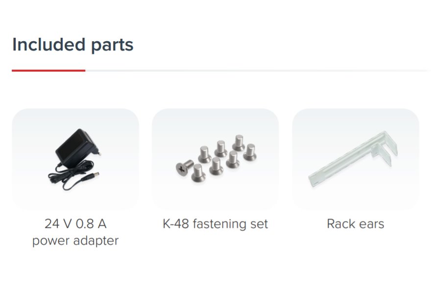 Součástí Cloud Smart Switch je operační systém SwOS. V balení jsou L profily pro uchycení do racku a napájecí adaptér.