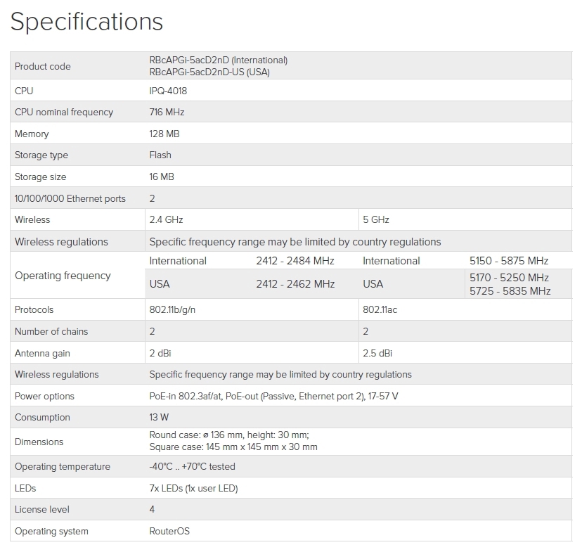 cAP ac navíc disponuje podporou PoE standardu 802.3af/at na prvním