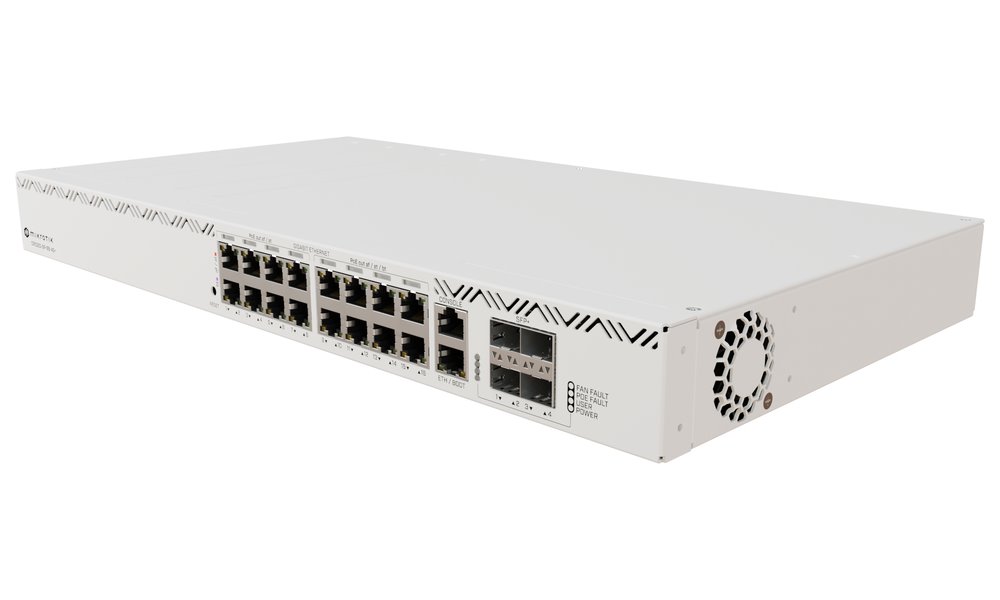 na 3. vrstvě s hardwarovou zátěží. Součástí switche je MikroTik
