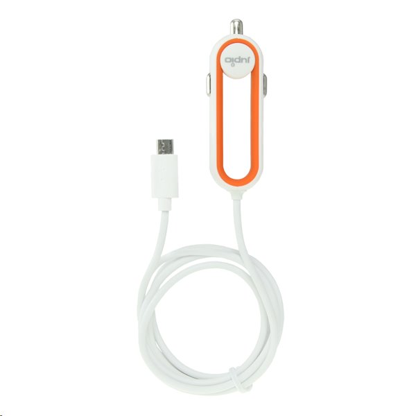 Bílá nabíječka Jupio do auta má 1 m dlouhý nabíjecí kabel a jednoduchý moderní design s oranžovými doplňky.