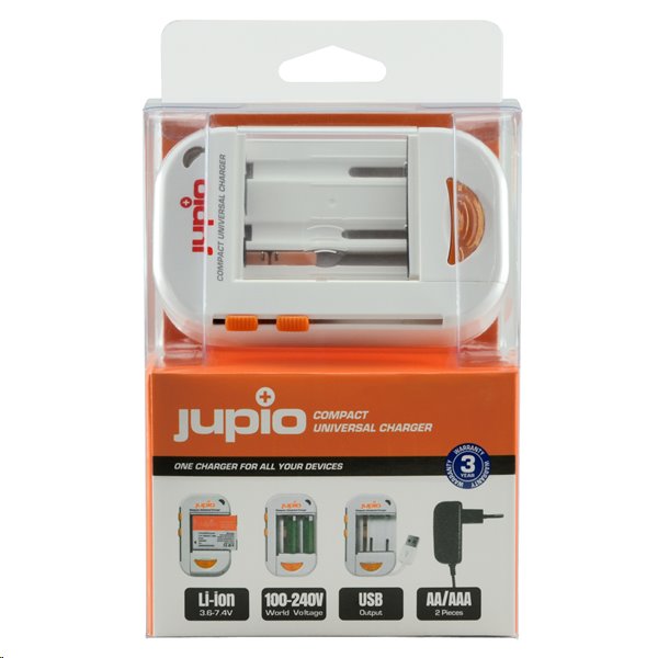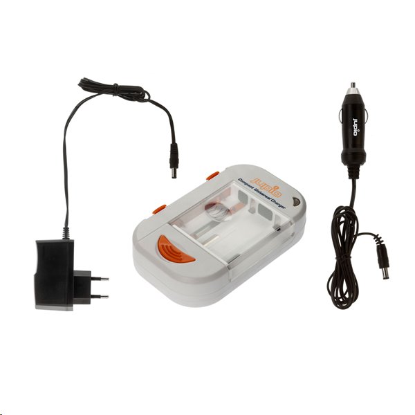 Kompaktní univerzální nabíječka Jupio LUC0050 pro tužkové (AA) a mikrotužkové (AAA) baterie a lithium-polymerové a lithium-iontové baterie pro fotoaparáty a videokamery s napětím 3,6 – 3,7 V a 7,2 – 7,4 V.