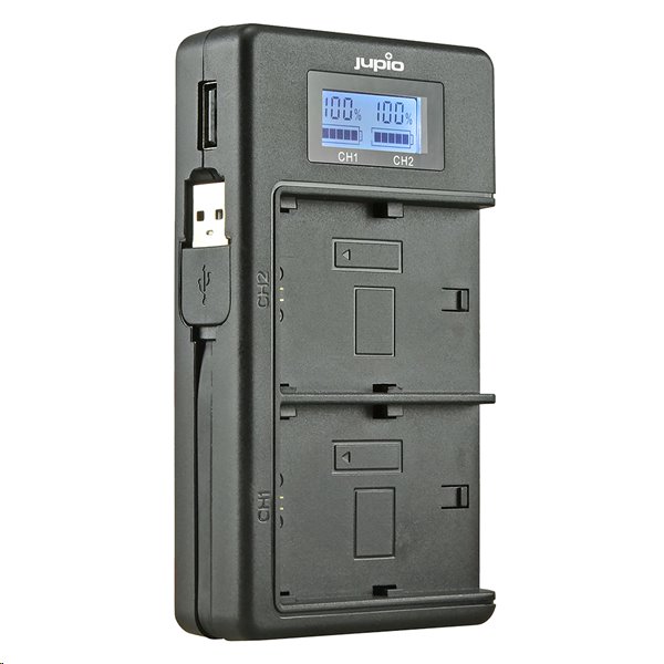 Inteligentní duální nabíječka s displejem Jupio JDC2005 může nabíjet až dvě baterie Canon LP-E17 zároveň. Napájení probíhá přes USB vstup.