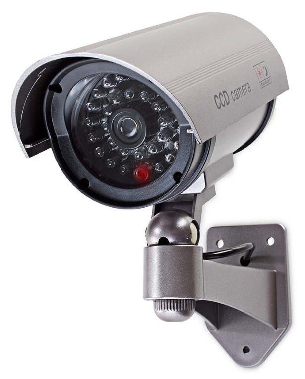 Atrapa venkovní kamery nabízí profesionální design. Vyznačuje se vestavěnou blikající LED a velmi realisticky vypadající falešnou infračervenou LED, což pomáhá zabránit vloupání. Je napájena dvěma AA bateriemi a lze ji snadno namontovat pomocí dodané konzole.