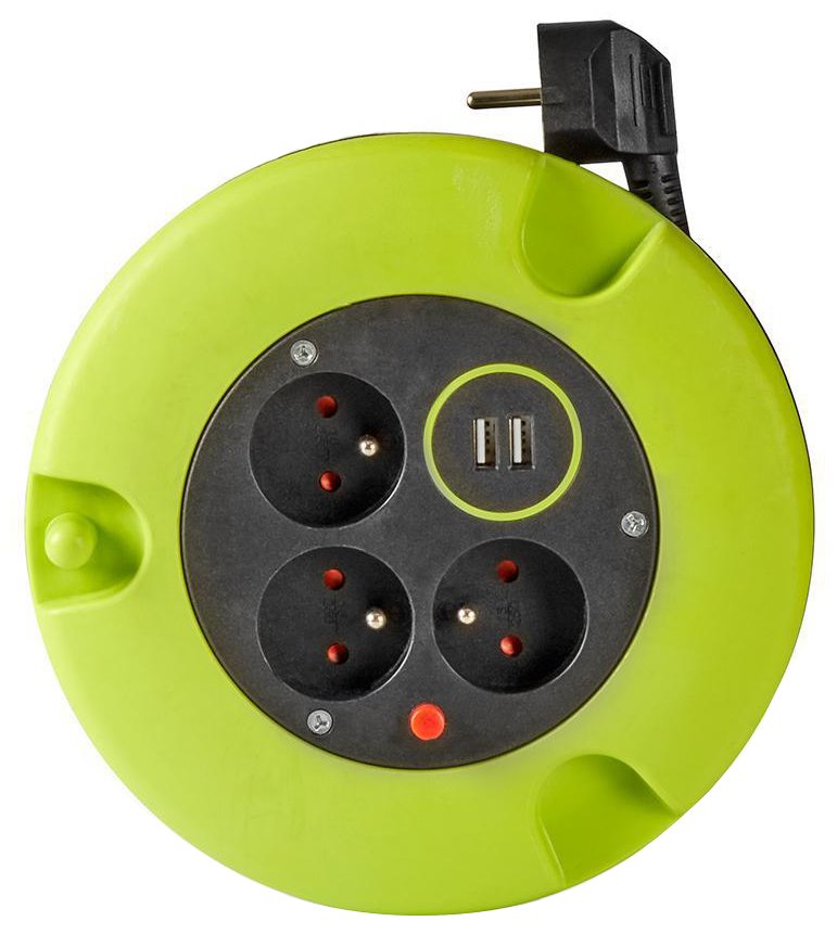 Prodlužovací napájecí kabel nabízí 3 zásuvky, 5 m dlouhý kabel a namotávací buben pro snadnou manipulaci. Je vybaven bezpečnostními dětskými záslepkami, tepelnou elektrickou pojistkou a dvěma USB porty pro nabíjení mobilních zařízení. Maximální zátěž při plném odmotání činí až 3680 W.