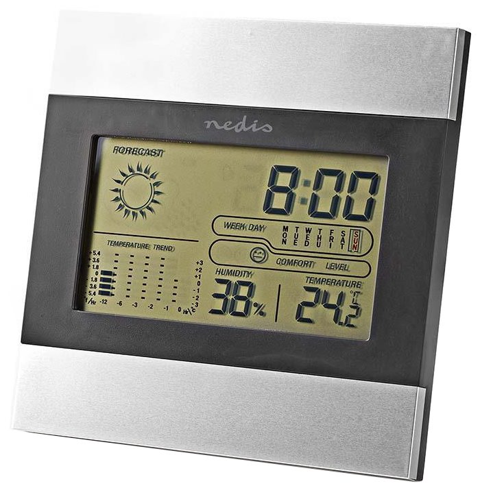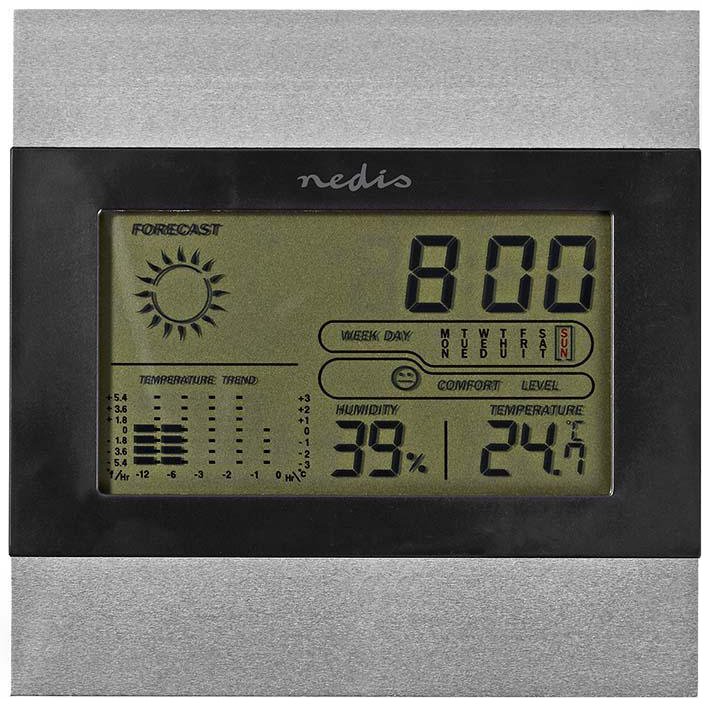 Digitální meteostanice s velkým LCD displejem nabízí zobrazení vnitřní teploty a vlhkosti vzduchu, předpovědi počasí, data, dne v týdnu a času. K dispozici je také budík s funkcí dřímání (Snooze), zobrazení vývoje teploty či indikátor komfortu, který ukazuje stav ovzduší v místnosti. Zajisté potěší paměť pro maximální a minimální naměřené hodnoty teploty a vlhkosti vzduchu. Díky výklopnému stojánku ji lze jak postavit na rovnou plochu, tak zavěsit na stěnu.