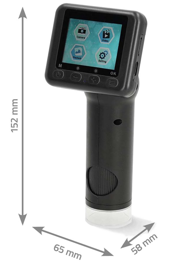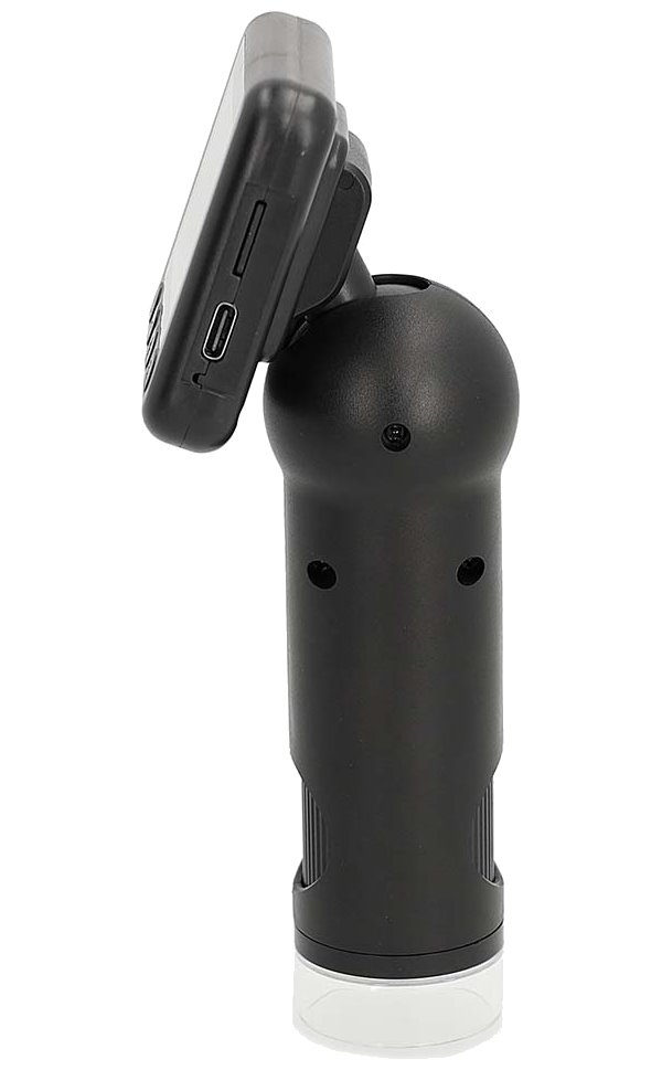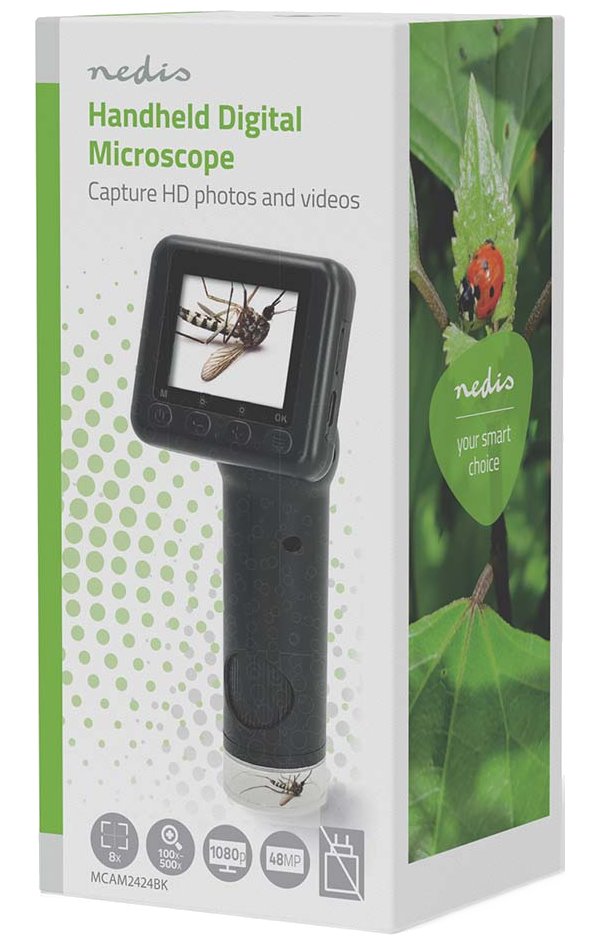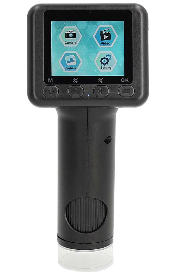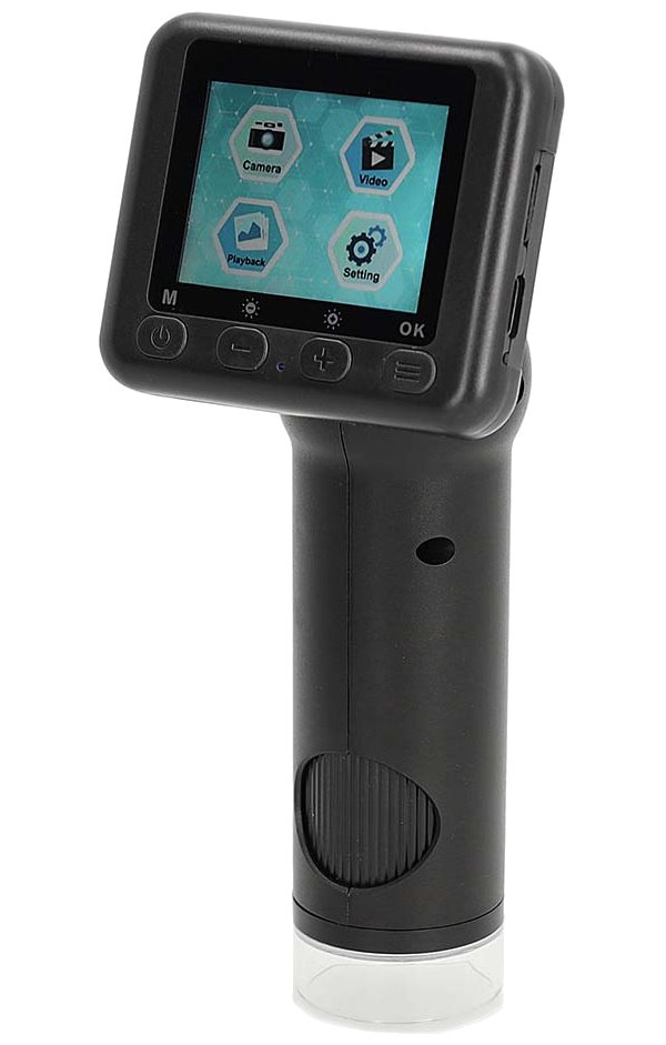Praktický ruční mikroskop pro objevování složitých detailů miniaturních objektů. Nabízí rozlišení 1920 × 1080 pixelů při 30 snímcích za sekundu (při interpolaci až 48 Mpx) a šest nastavitelných LED světel, která zlepšují viditelnost a ostrost obrazu. Faktor zvětšení lze nastavit od 100× až do 500×. Mikroskop disponuje 2" barevným LCD displejem, který lze pro dosažení optimálního sledovacího úhlu naklánět v rozsahu 45°. Napájen je pomocí vestavěné dobíjecí baterie s kapacitou 1000 mAh, která zaručí až 5 hodin nepřetržitého provozu. Nabíjení baterie probíhá prostřednictvím portu USB-C. Pro uložení dat je přítomen slot na microSD kartu s kapacitou až 32 GB.