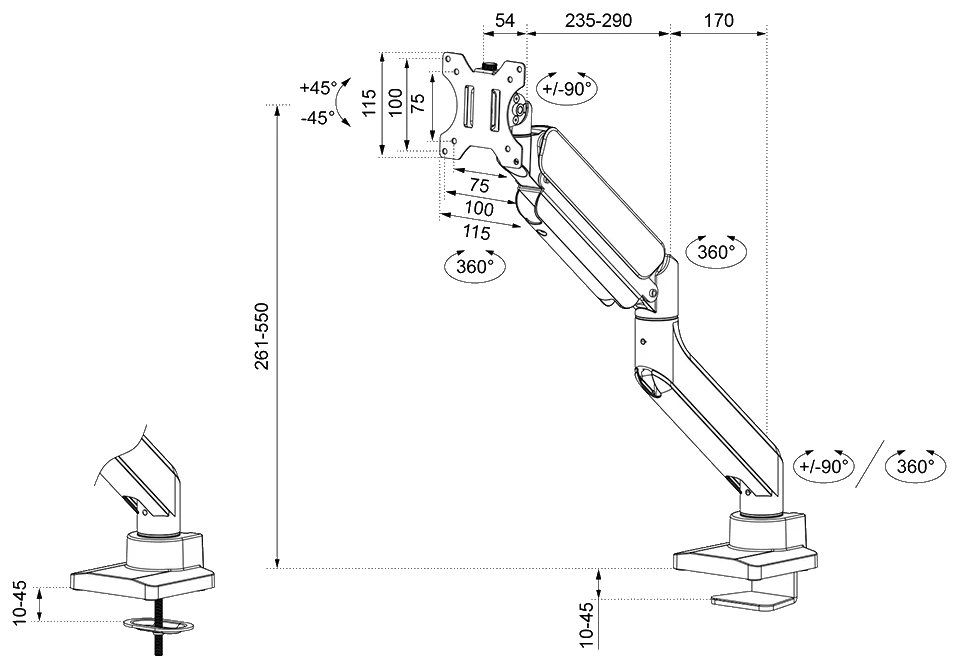 Flexibilní stolní VESA držák pro zakřivené LCD monitory o velikosti 17" až 49" a hmotnosti do 14 kg (nezakřivené monitory až 18 kg). Je vybaven zesílenou hlavou a navržen tak, aby podporoval vyšší zatížení. Nastavení výšky pomocí plynové pružiny v rozmezí od 26,1 až 55,5 cm. Univerzální technologie naklápění, otáčení a natáčení umožňuje optimální nastavení. Balení obsahuje stolní svorku i průchodku.