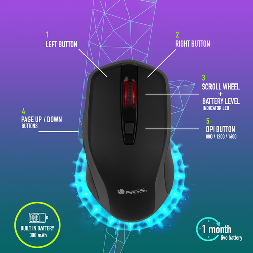 Optická myš využívá citlivý snímač s rozlišením až 1600 dpi. Disponuje pěti tlačítky a rolovacím kolečkem. Připojení lze jednoduše realizovat pomocí USB adaptéru a technologie 2,4 GHz. Napájení zajišťuje vestavěná baterie s kapacitou 300 mAh, která při plném nabití udrží myš v chodu až 1 měsíc. Výhodou je také barevný LED indikátor, poskytující informace o nízkém stavu baterie a také samostatné tlačítko pro zapnutí či vypnutí myši, které zajistí delší životnost baterie.