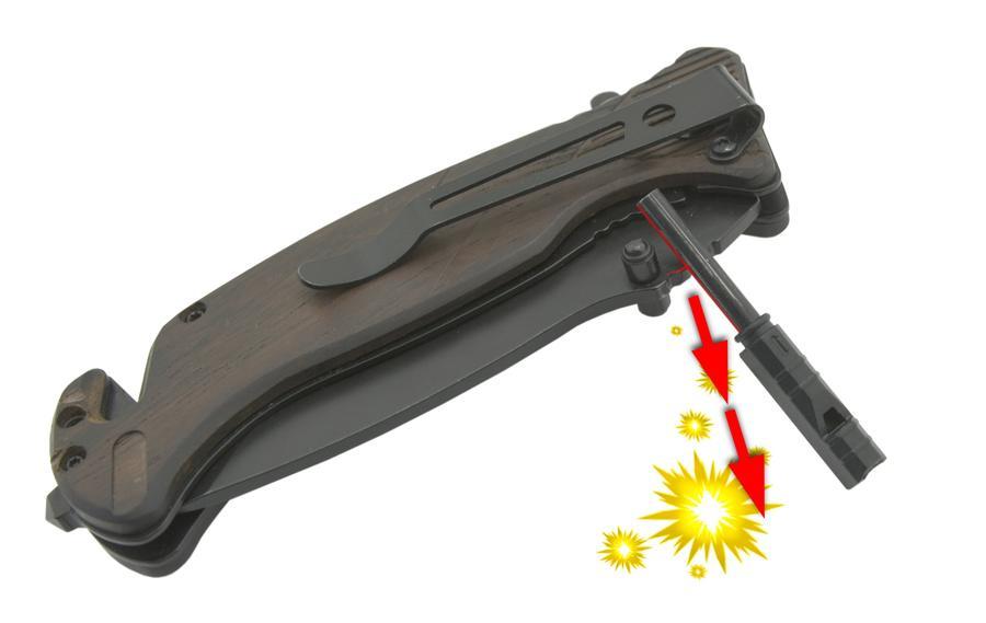 Součástí střenky na přední straně je klíč na matice velikosti 6, 8, 10, 12 mm. V zadní části je škrkátko, které společně s vroubkovanou horní částí čepele využijete jako křesadlo či píšťalku. Střenka na zadní části je opatřena klipsem, pro uchycení například za opasek. Přední část nože je vybavena břitem pro přeříznutí lana do šíře zhruba 6 mm a v zadní části těla je umístěn klín pro nouzové rozbití okna.