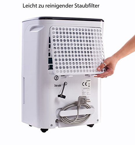 Odvlhčovač je vybaven 3 l nádržkou na kondenzát s průsvitným indikátorem vodní hladiny a protiprachovým filtrem, který je možné kdykoliv vyjmout a vyčistit. Konstantní hladina vlhkosti je zajištěna pomocí zabudovaného senzoru vlhkosti.