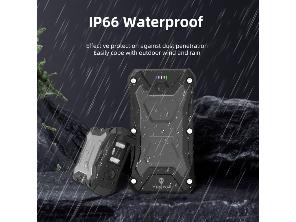 Outdoorová powerbanka Viking SKADI II je vyrobenaz odolného materiálu(ABS+PC), který snese náročné podmínky v přírodě.Voděodolné (IP66) a nárazuvzdorné (SHOCKPROOF)provedení znamená, že ji můžete bezpečně používat při turistice,
