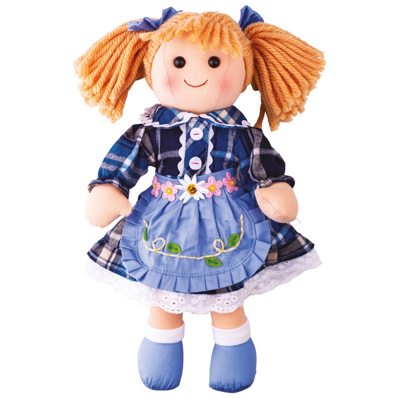 Seznamte se s Katie! 34cm látková panenka Bigjigs Toys Katie je určená těm nejmenším, takže je měkoučká a příjemná na dotek. Katie nemá ráda nic jiného než zábavnou hru, po které následuje láskyplné objetí a polibky před spaním. Nosí krásné koskované šatičky, modrou zástěru a modré mašličky ve vlasech. Katie pochází ze série panenek od Bigjigs Toys, kde je každá panenka jiná a má své vlastní jméno. Další oblečení pro Katie i další panenky Bigjigs Toys můžete dokoupit samostatně a tím rozšířit šatník jednotlivých panenek.
