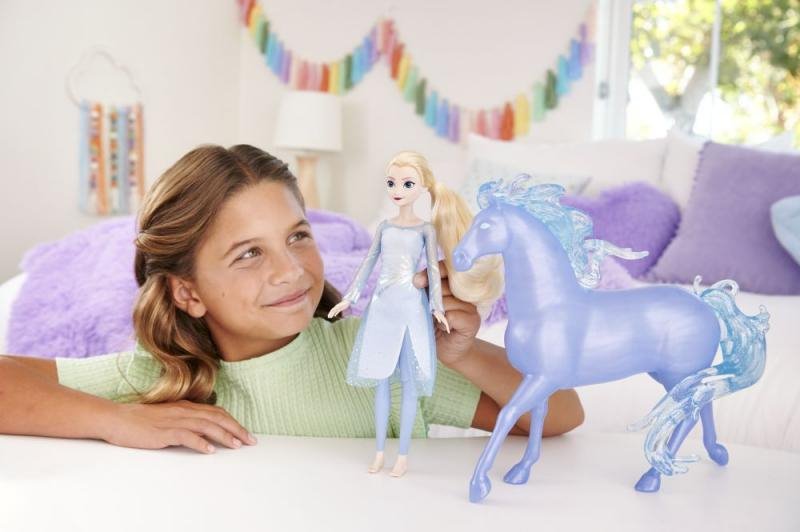 Potěšte své dítě panenkou Elsou a jejím koněm Nokkem. Hračka nadchne všechny malé fanoušky filmu Ledové království 2 (angl. Frozen 2). Elsa má na sobě šaty s potiskem z měkkého materiálu. Díky pohyblivým kloubům v kolenou ji může váš potomek posadit na koně. Nokk je ozdobený perleťovými a třpytivými detaily a na sobě má klip, do kterého panenku při posazení na koně uchytíte.