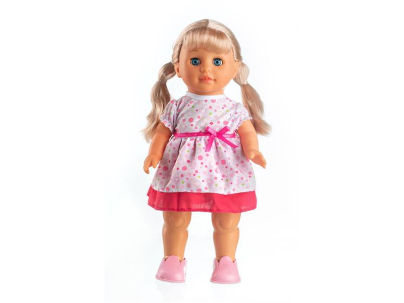 stisknutí tlačítka na bříšku začne panenka chodit a zpívat: "Ahoj,