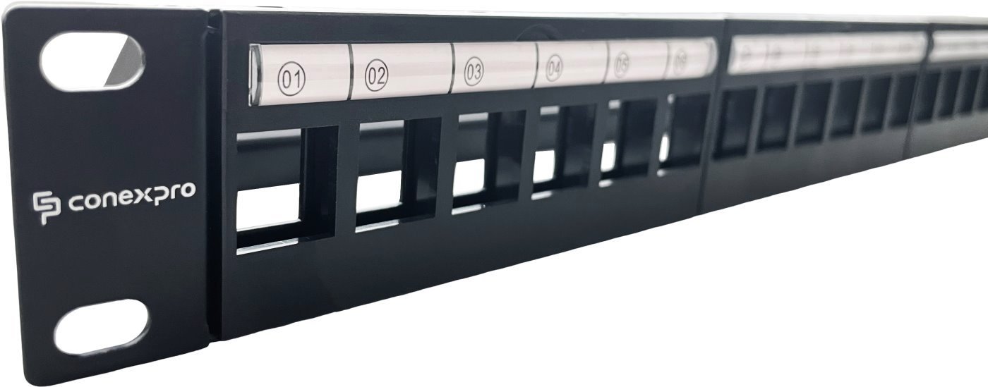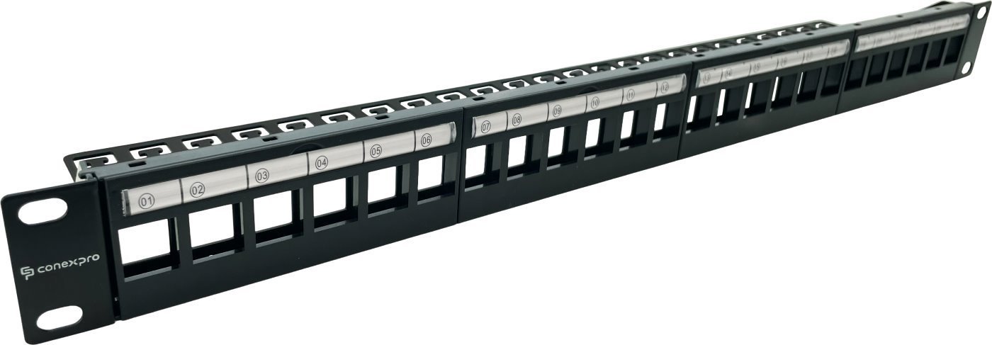 Modulární patch panel Conexpro využijete s 19" datovými rozvaděči s 24 porty pro plastové i kovové keystony. Ty mohou spadat do různých kategorií – CAT5E, CAT6, CAT6A, CAT7 a CAT8. Panel je kovový a vybavený plastovým čelem.