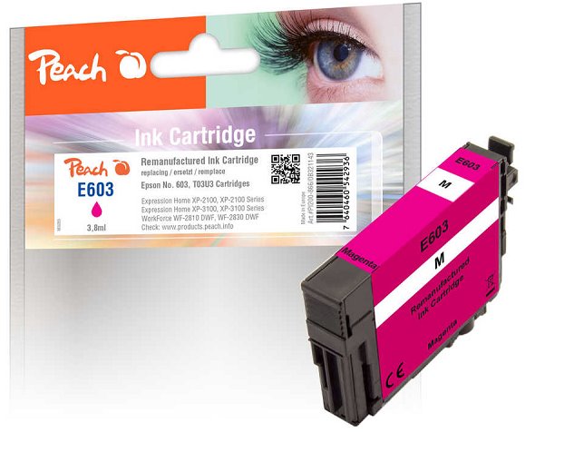Technical Data Brand Peach SKU 321143 (PI200-866) EAN 7640460542936 Manufacturer ID Epson No. 603M, C13T03U34010 Obsah 3.8 ml Color purpurová Yield S Kompatibilní tiskárny (13) Epson Expression Home XP-2100 Epson Expression Home XP-2100 Series Epson Expression Home XP-2105 Epson Expression Home XP-3100 Epson Expression Home XP-3100 Series Epson Expression Home…