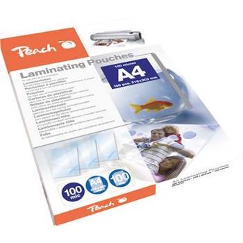 Peach Laminovací fólie A4, 100mic, lesklé, 100ks 100 ks lesklých laminovacích fólií (kapes) o tloušťce 100 µm, určených pro laminování dokumentů velikosti A4.