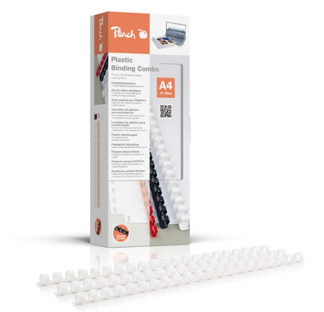 Vázací hrbet Peach 21 kroužkový, 10mm, 65 listu, A4, bílý, 100ks Brand Peach SKU 510081 (PB410-01) EAN 7640106494094 Color Diameter 10 mm Prumer 10 mm Kapacita vazby 65 strany Binding capacity 65 pages