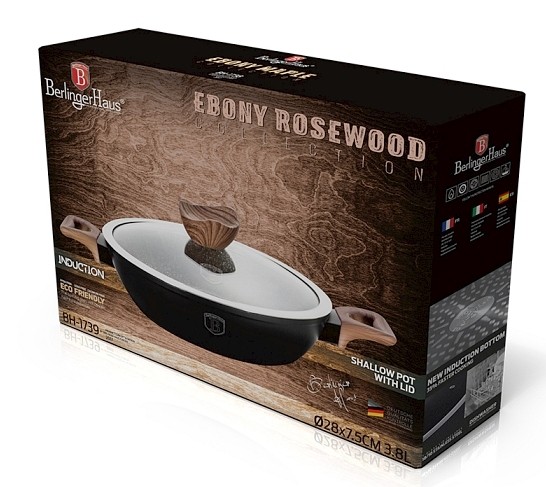 Kulatý pekáč kolekce Ebony Line Rosewood značky Berlingerhaus má objem 3,8 l a žáruvzdornou skleněnou poklici. Pekáč BH-1739 je vyrobený z kovaného hliníku s 3vrstvým mramorovým povrchem, který je chrakteristický svou nepřilnavostí. Pekáč je vhodný na všechny druhy ohřevu, včetně indukce i do myčky nádobí. Pekáč má Turbo indukční dno pro efektivní vaření a ergonomicky měkčené rukojeti pro snadný a pohodlný úchop.