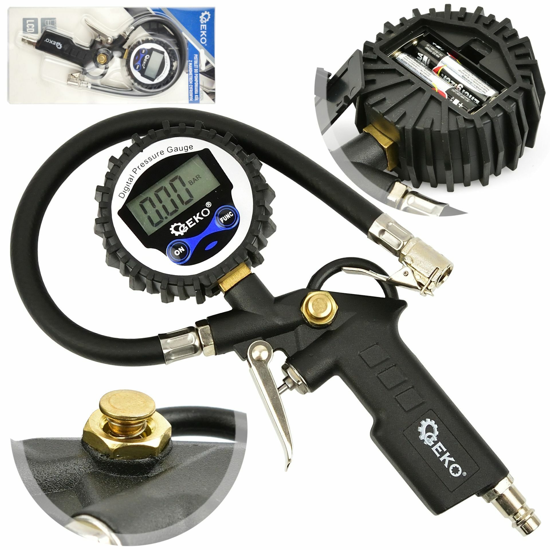 Profesionální pneumatickou pistoli značky GEKO využijete pro huštění kol u osobních a nákladních automobilů. Je vybavená tlakoměrem s velkým, dobře čitelným LCD displejem a 30 cm dlouhou hadicí. Displej před otřesy a nárazy chrání gumový kryt. Měřit můžete ve čtyřech jednotkách - PSI, bar, kPa, kg/cm2.
