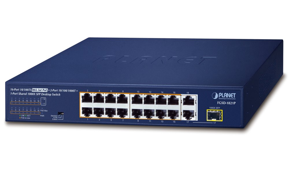 PoE+ přepínač, 2x 10/100/1000 Base-T RJ-45, 16x 10/100