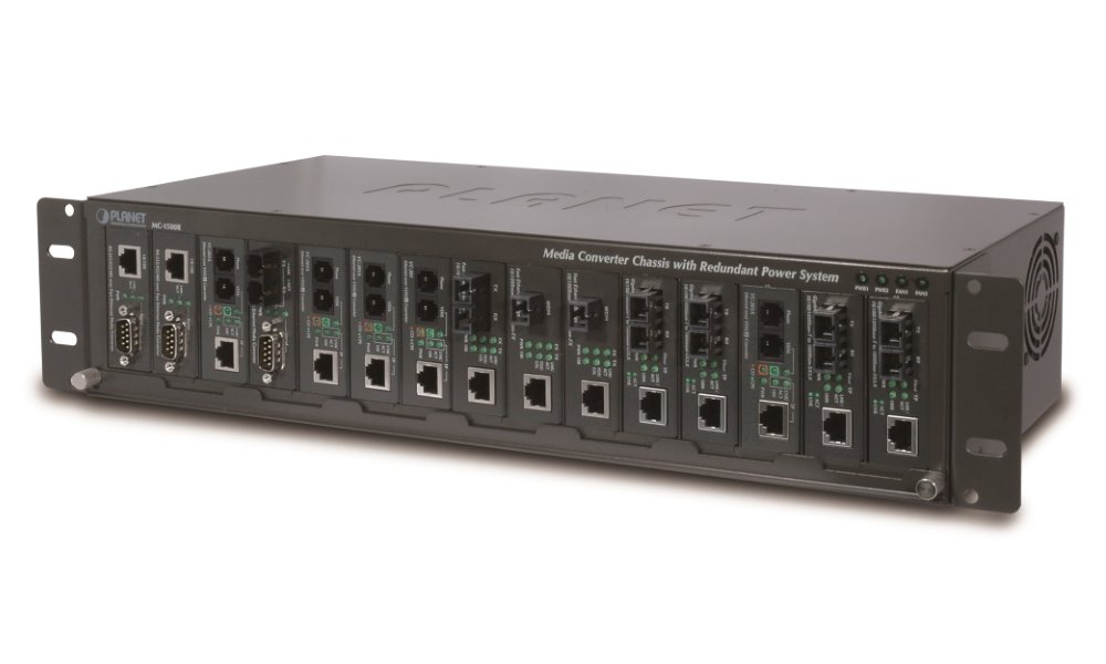 15-ti slotové šasi pro instalaci média konvertorů. Vnitřní napájení