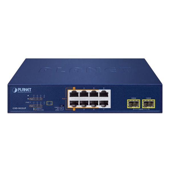 Porty: 8× 10/100/1000Base-T RJ-45, 2× 1000Base-X SFP