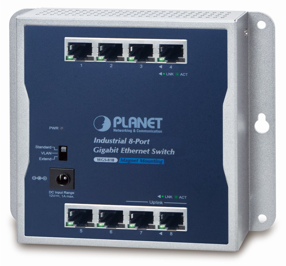 Gigabitový průmyslový přepínač s 8 x RJ-45 10/100/1000Base-T porty. Instalace na zeď (fixně/magneticky) nebo na DIN lištu přímo do rozvaděčů. Kovové provedení IP30, konstrukce je odolná vůči pádu a vibracím. DIP přepínač (standard/VLAN/extend mód), ESD ochrana do 4 kV, bez ventilátorů, napájení 12 V DC.