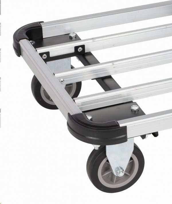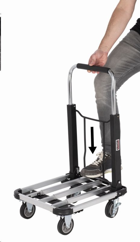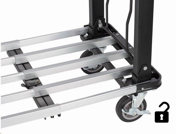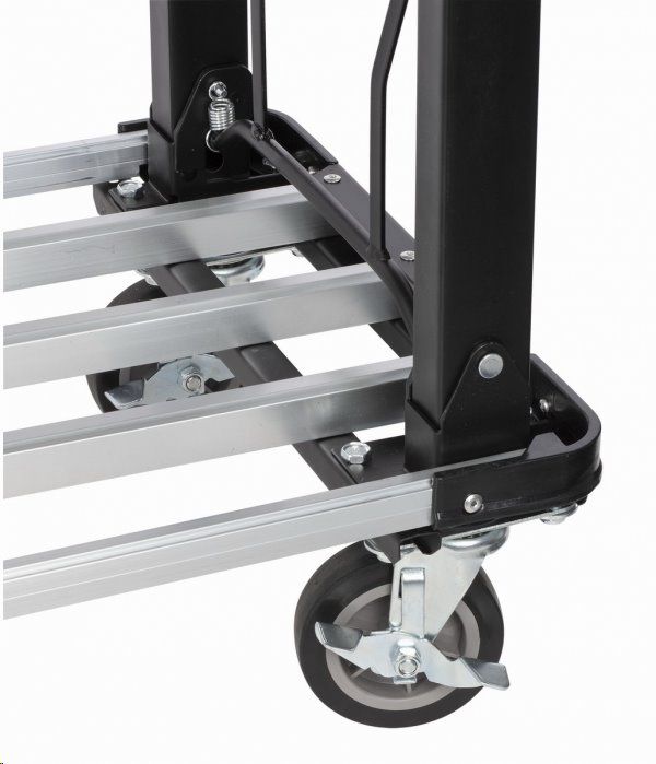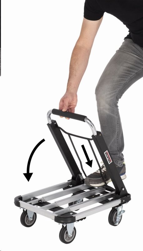 Maximální nosnost vozíku je 150 kg. Ložná plocha o rozměru 500 x 410 mm lze díky teleskopickému provedení vysunout a poskytuje tak plochu až 710 x 410 mm. Teleskopické je také madlo vozíku, které zle snadno sklopit.