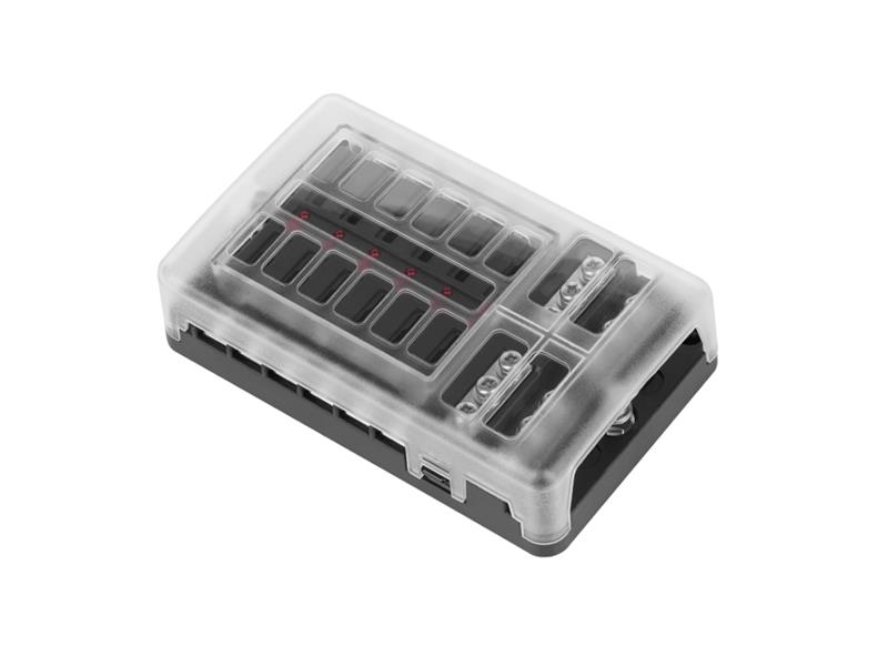 Pojistková skříňka FB-12 se zápornou lištou a LED Technické parametry: - Počet zásuvek: 12, Typ 19 mm - Upevnění: šrouby 5 mm - Max. Provozní napětí 32V - Max. Zátěž na jeden obvod 30A - Max. Pracovní zátěž na bloku 100A - Certifikát: RoHS, EC
