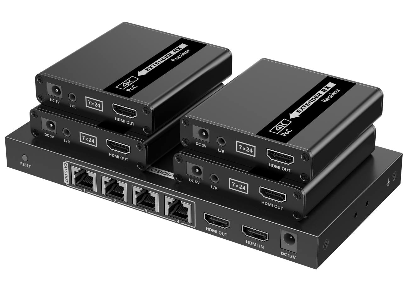 - Výstupy: 1x lokální výstup HDMI na vysílači, 4 x HDMI výstupy