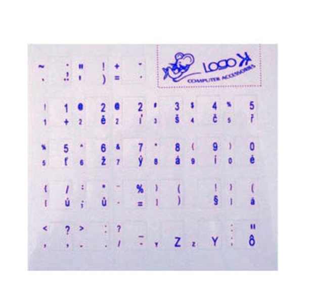 Speciální průhledná samolepící fólie s českými znaky v modré barvě pro polepení klávesnic.