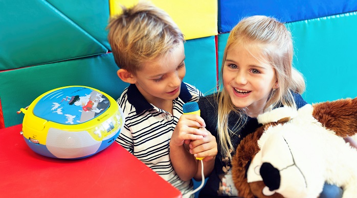 Podpořte zálibu vašich dětí ve zpívání. Mikrofon a karaoke funkce s hudebním podkresem budou bavit celou rodinu. Můžete si zazpívat duet s vašimi oblíbenými zpěváky a hudebními skupinami. Nemáte zrovna náladu na zpěv? Přehrávač zvládá přehrát CD-R a CD-RW disky, včetně podpory oblíbeného MP3 formátu. Díky USB vstupu nemá problém ani s přehráním hudby z Flash disku. Samozřejmostí pak je i analogový FM tuner. Maxipřehrávač můžete mít ve dvou různých barevných provedení a je napájen buď z elektrické sítě nebo bateriemi.