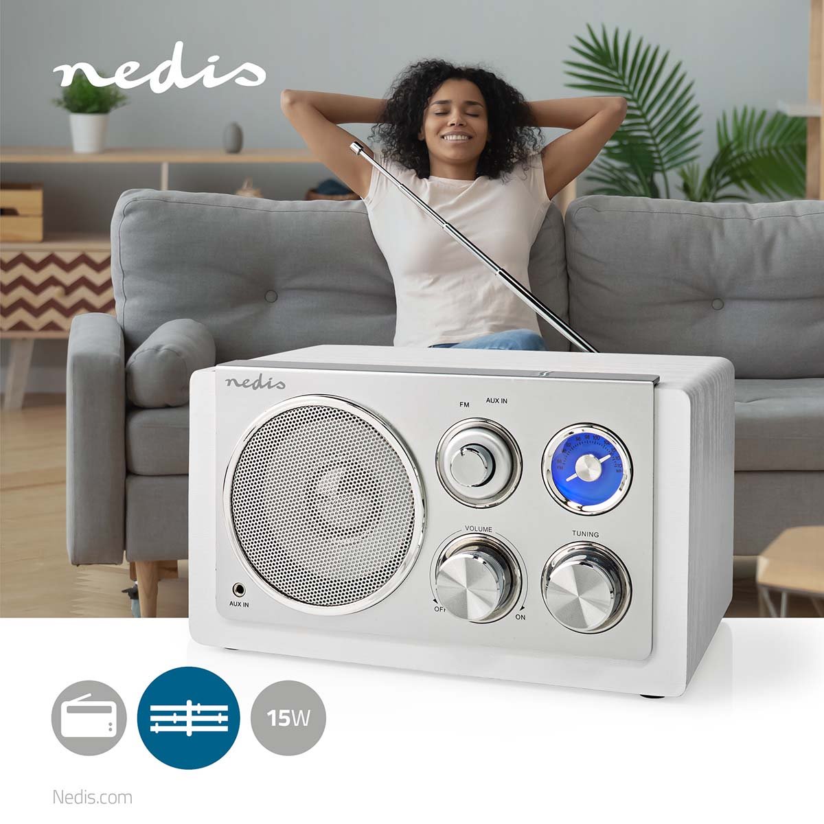 Designový FM radiopřijímač Nedis RDFM5110WT v bílo-stříbrném provedení