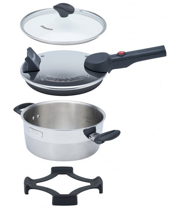 Elektrická pečící mísa Remoska Dua je multifunkční kuchyňské zařízení, které díky dvěma různým víkům umožňuje vaření a pečení v jednom hrnci. Základem je pečicí hrnec, vyrobený nejmodernější technologií ze speciálního 3vrstvého materiálu Trimetal, který je ideální pro dokonalý rozvod tepla po celém povrchu hrnce. Víko s topným tělesem je ideální k přípravě pokrmů vařením, pečením, dušením i zapékáním. Skleněná poklice je vyrobena z tvrzeného bezpečnostního skla a osazena plastovým držadlem. Přívodní kabel je pro snazší manipulaci a uskladnění odnímatelný.