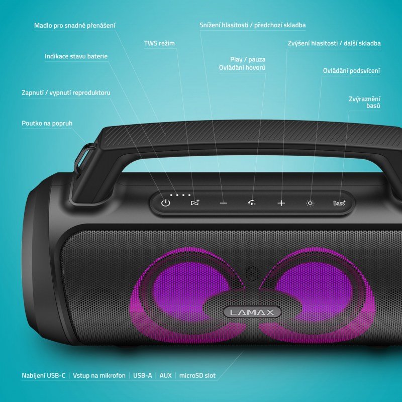 Reproduktor Lamax PartyGo1 nabízí výkon 100 W. Technologie LAMAX BeatBass® zajistí špičkovou kvalitu zvuku. Na ovládacím panelu si můžete přepínat skladby, zvýraznit basy nebo změnit hlasitost. Funguje i jako powerbanka, USB-A vstup můžete využít pro nabíjení svých zařízení.
