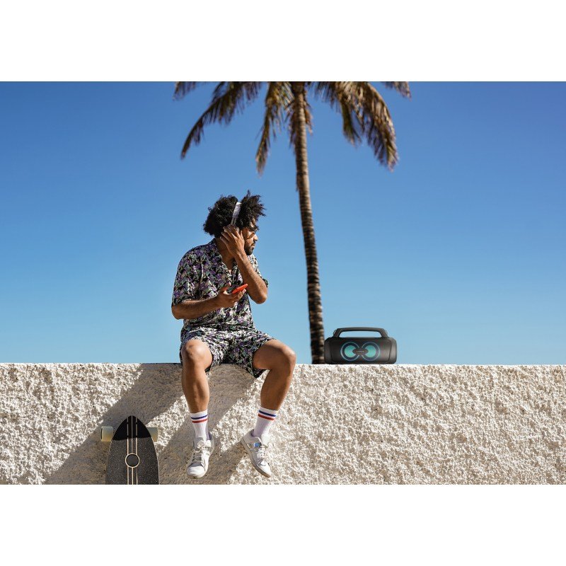 Máte rádi karaoke? V balení najdete mikrofon, který k reproduktoru jednoduše připojíte. O výdrž baterie se nemusíte obávat, na jedno nabití vydrží až 20 hodin. Na její aktuální stav vás upozorňuje světelný indikátor. Když se vám baterie vybije, nabijete ji skrze univerzální USB-C kabel. 3 stylové režimy LED podsvícení pak ozvláštní každou společenskou akci.