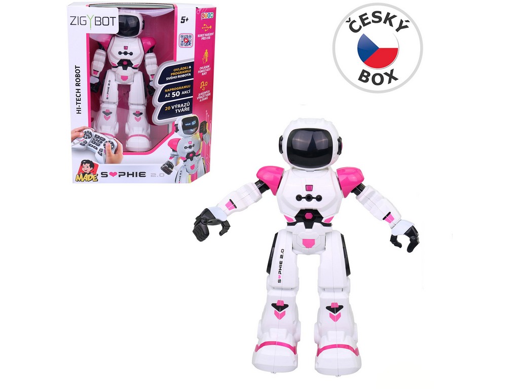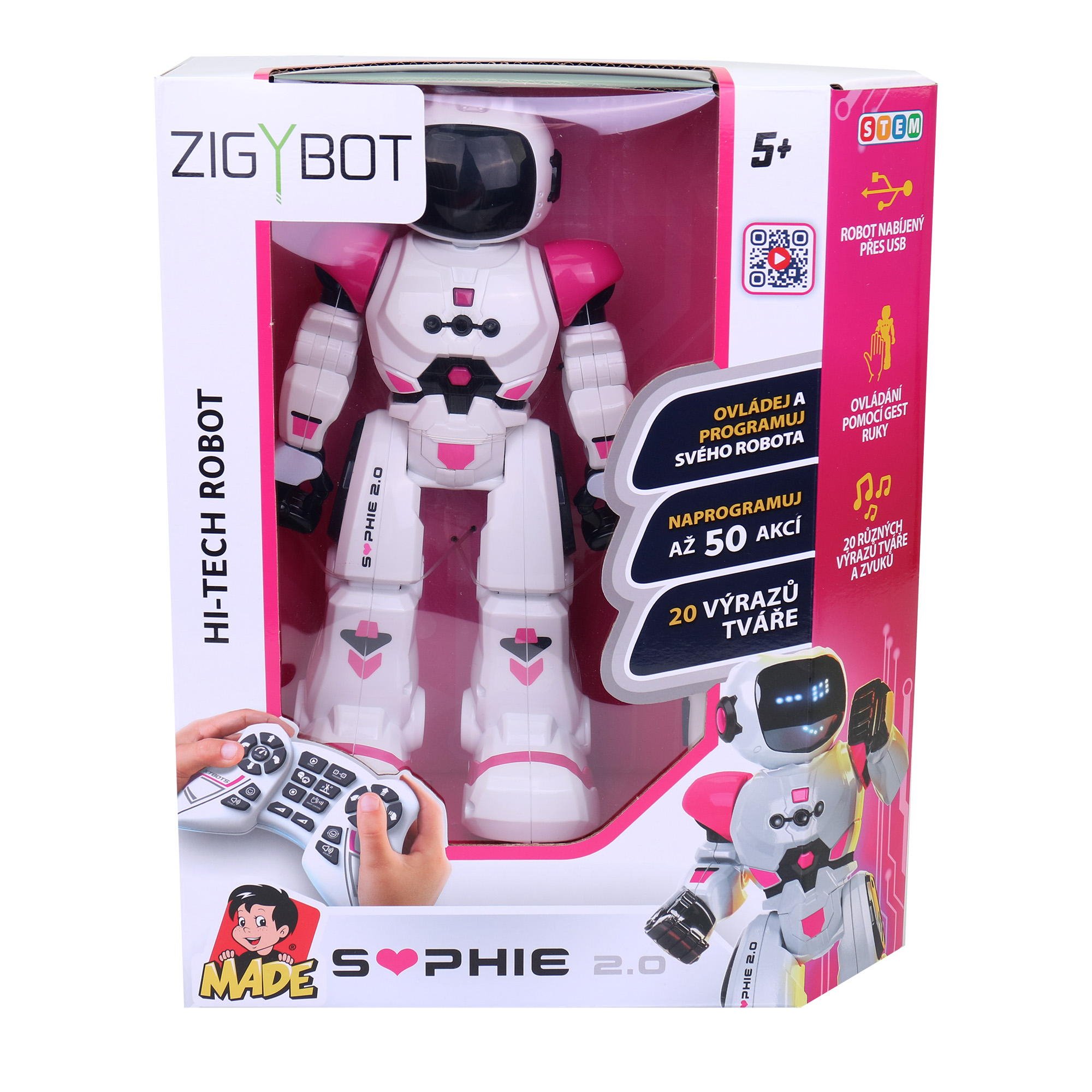 Interaktivní robot Zigybot Sophie se stane skvělým dárkem pro vaše dítě. Umí měnit výrazy v obličeji. Zobrazují se pomocí LED diod. Sophie má celkem 4 nálady. Dokáže být šťastná, smutná, rozzlobená nebo překvapená. Její nálady vaše ratolest mění stisknutím tlačítka na ovladači. Také může zmáčknout tlačítko pro rozšířené nálady. Poté robotka mění výraz náhodně a vydává u toho robotické zvuky. Váš potomek si pro ni vymyslí spoustu různých dobrodružných příběhů. Sophie se dokáže pohybovat do všech stran.