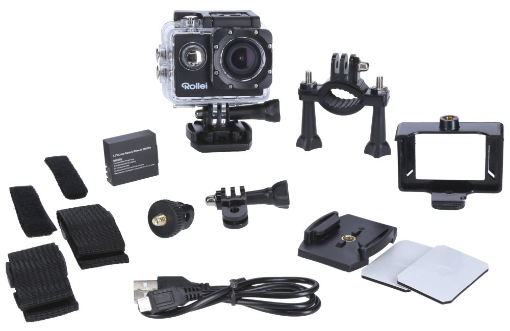 Součástí balení je podvodní pouzdro, které je vodotěsné až do 40 metrů, vyměnitelná baterie, držák na řídítka, klip, 4 držáky, popruhy, nálepky, kabel USB a karta micro SD s kapacitou 16 GB.