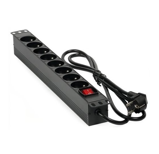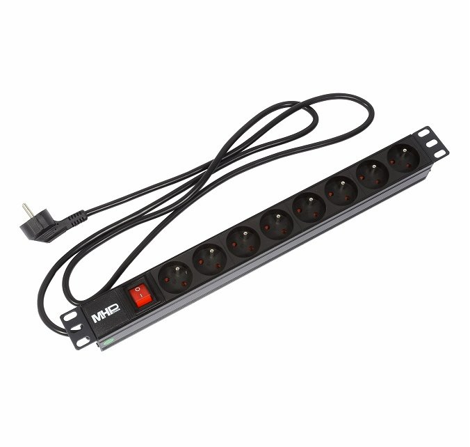 MHPower PDU-FR4K8 v hliníkovém provedení je napájecí rozvodný kabel, který se hodí do 19" datového rozvaděče. Najdete na něm osm 230V vývodů. K panelu vede 1,8 m dlouhý přívodní kabel s klasickým zakončením a tlačítkem pro vypnutí pro větší bezpečnost. Panel zvládne maximální zatížení až 16 A.