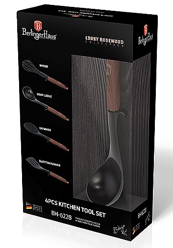 Sada kuchyňského náčiní kolekce Ebony Line Rosewood obsahuje šlehací metlu, naběračku, pěnovačku a obracečku v krásném dřeveném designu. Náčiní je vyrobené z nylonu, který je šetrný k vašemu nádobí a nikdy je nepoškrábe. Díky praktické nožičce uprostřed náčiní je můžete položit, aniž byste si zašpinili kuchyňskou linku. Kuchyňské náčiní je ideální pro mramorové, keramické a nepřilnavé povrchy a je odolné do 180 °C. Všechno náčiní má očko, takže je můžete pohodlně zavěsit.