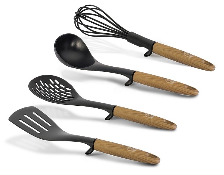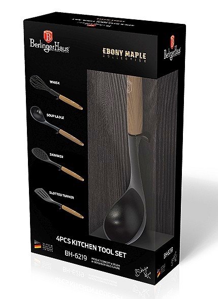 Sada kuchyňského náčiní kolekce Ebony Line Maple obsahuje šlehací metlu, naběračku, pěnovačku a obracečku v krásném dárkovém balení. Náčiní je vyrobené z nylonu, který je šetrný k vašemu nádobí a nikdy je nepoškrábe. Díky praktické nožičce uprostřed náčiní je můžete položit, aniž byste si zašpinili kuchyňskou linku. Kuchyňské náčiní je ideální pro mramorové, keramické a nepřilnavé povrchy a je odolné do 180 °C. Všechno náčiní má očko, takže je můžete pohodlně zavěsit.