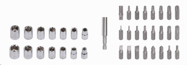 41dílná sada flexibilního ráčnového šroubováku, šroubovacích bitů a nástrčných klíčů v plastovém kufříku.