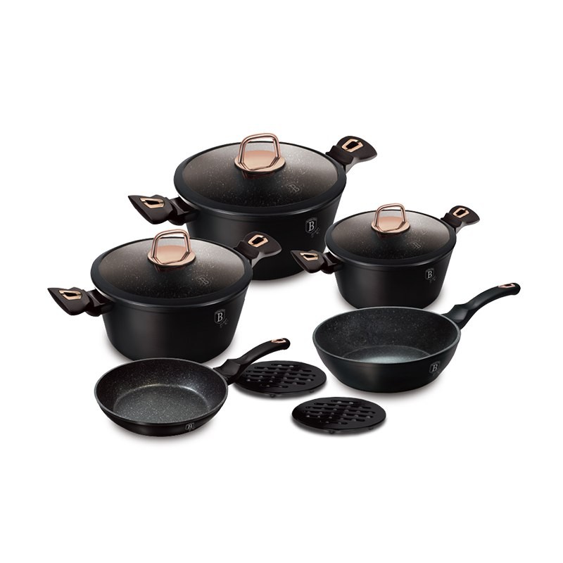 Se sadou nádobí Berligerhaus z kolekce Black Rose si usnadníte vaření oběda či večeře. Využijete ji pro přípravu polévek, omáček, těstovin, masa, zeleniny a dalších oblíbených pokrmů. Je vhodná pro všechny druhy varných desek, včetně indukce. Set obsahuje 2 pánve, 3 kastroly s cedícími poklicemi a 2 bakelitové podložky pod hrnec.